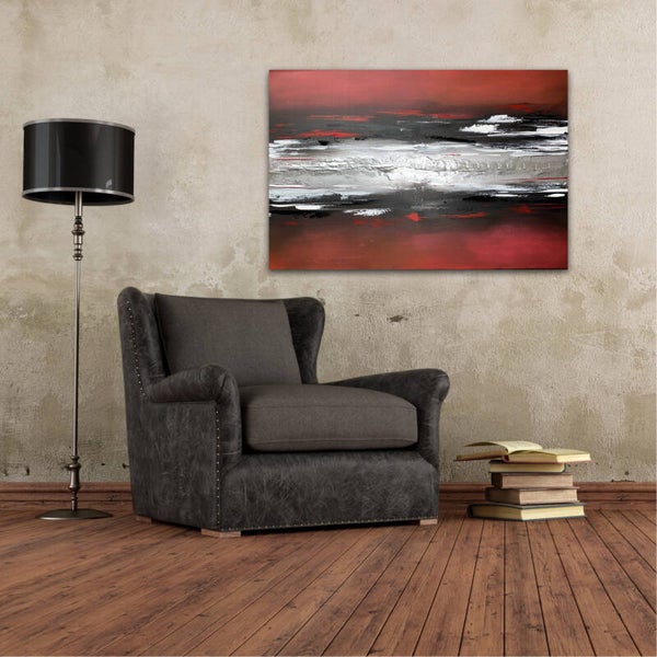 The upper section fades from black into deep, muted red hues, suggesting an atmospheric or smoky effect. Subtle streaks of white and red emerge within the black, adding texture and complexity. The lower portion features a warmer red gradient that deepens toward the bottom, balancing the composition with a grounding warmth.