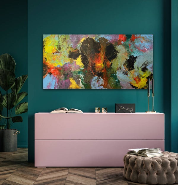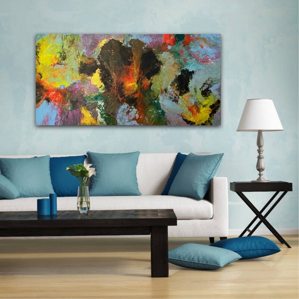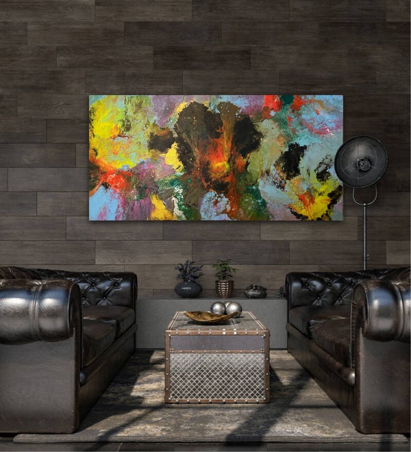 This captivating abstract artwork bursts with vibrant energy and bold contrasts. Featuring dynamic hues of yellow, red, green, and black interwoven with softer blues and purples, the piece evokes a sense of natural forces in motion. The textured layers and organic forms create a fluid composition that draws the viewer into its depth and complexity. A striking addition to modern or eclectic spaces.