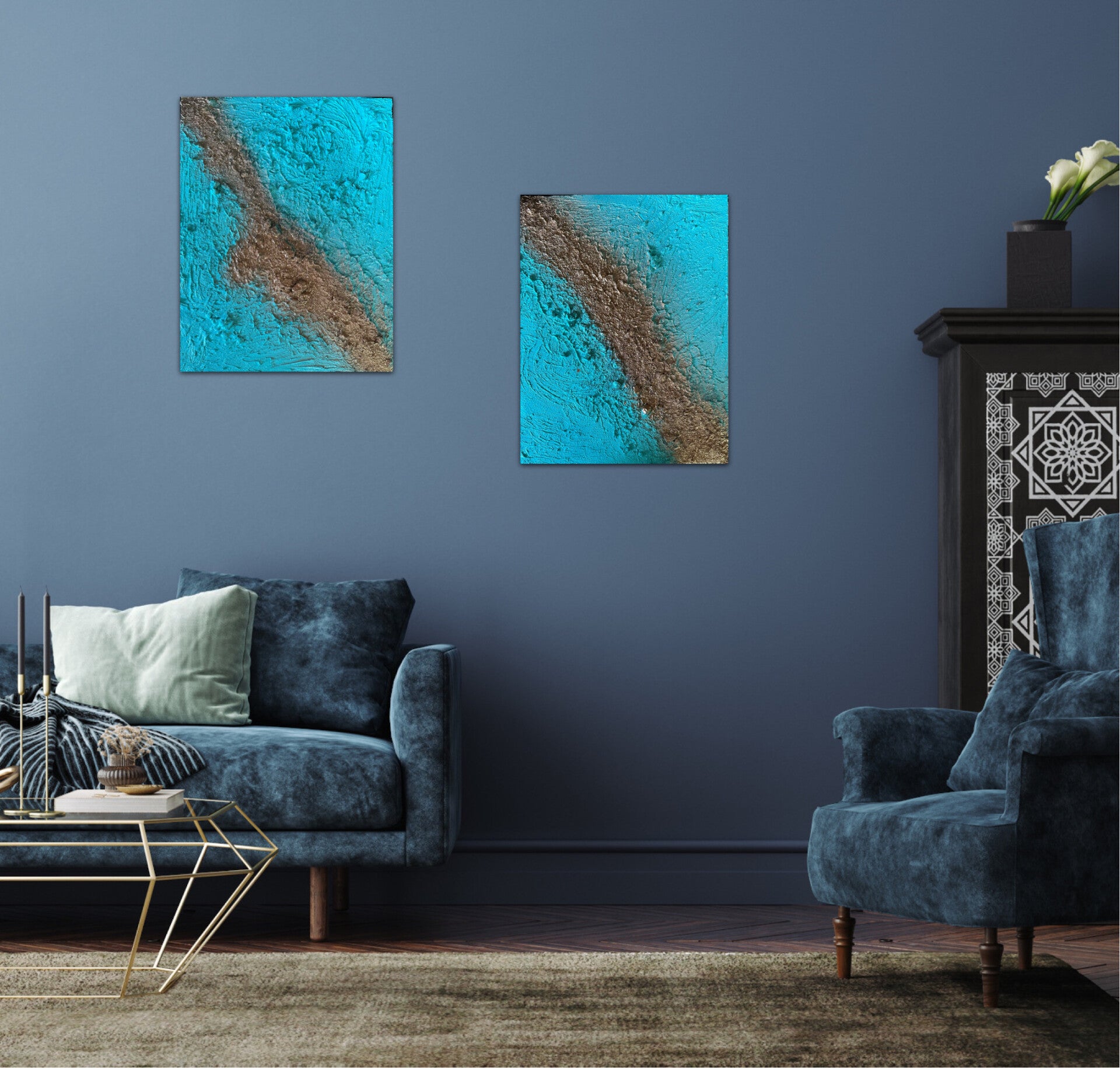 These paintings feature a bold abstract composition with a dominant turquoise blue background, which is textured and dynamic. A diagonal earthy brown streak cuts through the canvas, adding contrast and depth. The textured surface creates a sense of movement and flow, reminiscent of natural formations like rivers or geological patterns. The color palette emphasizes the balance between vibrant and neutral tones, making it visually striking yet harmonious. It would fit well in a modern or minimalist setting as a centerpiece or accent piece.
